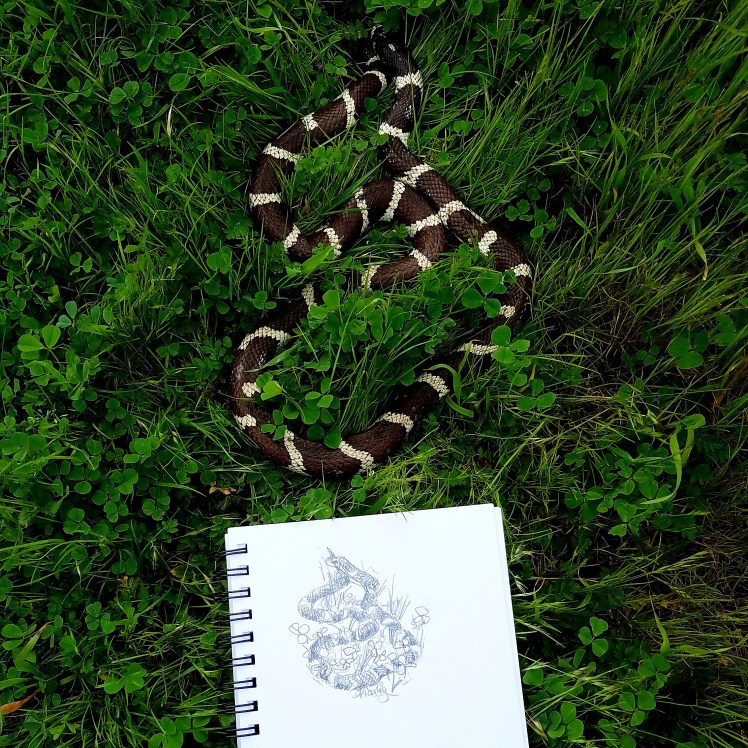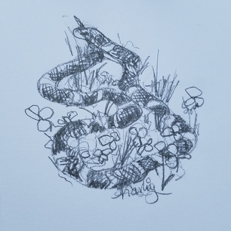 After a wet winter, Kingsnakes started appearing at the Las Gallinas Wildlife ponds. I saw two snakes in the same locations. It was still wet and cold and they weren’t moving much. I was able to sketch one without it moving.
