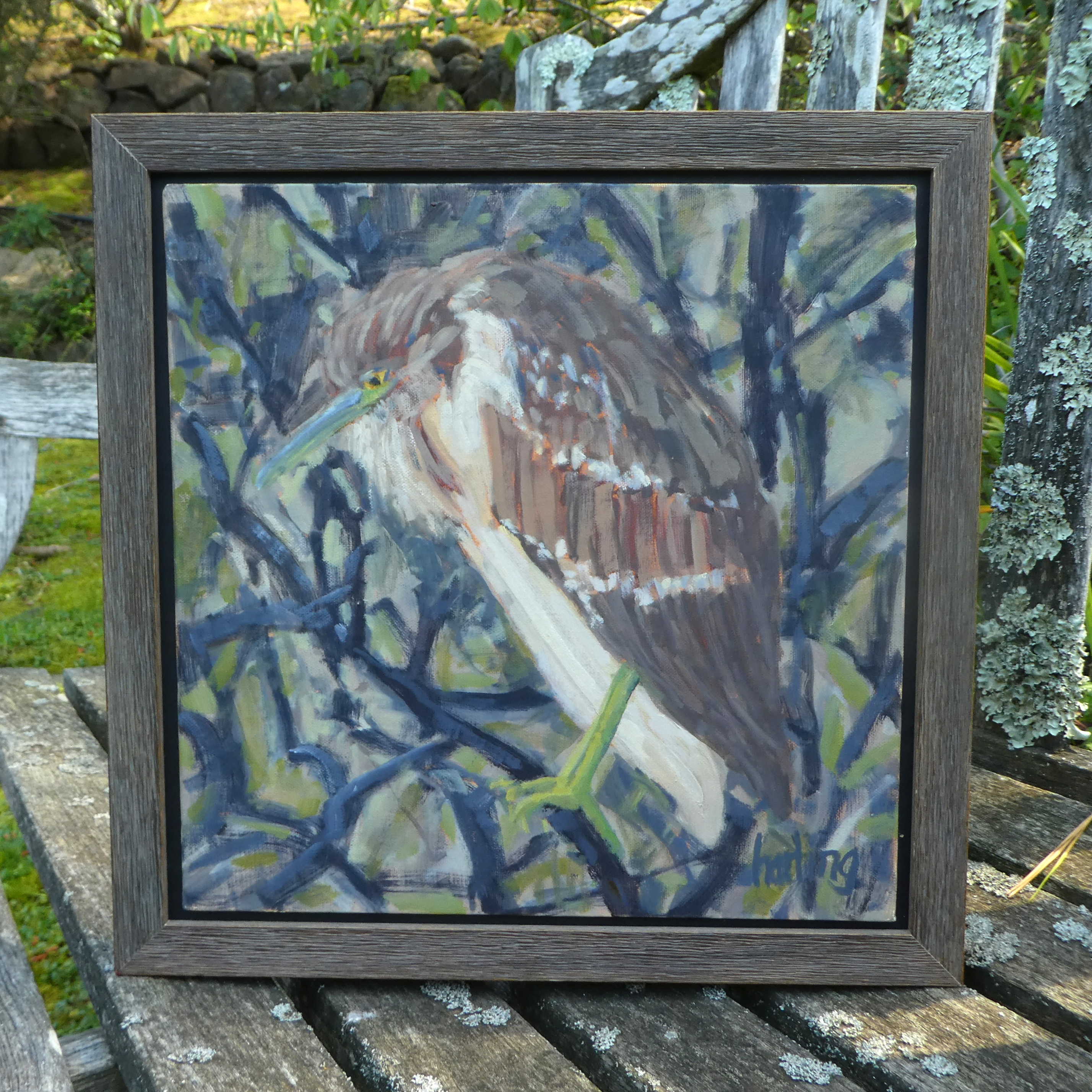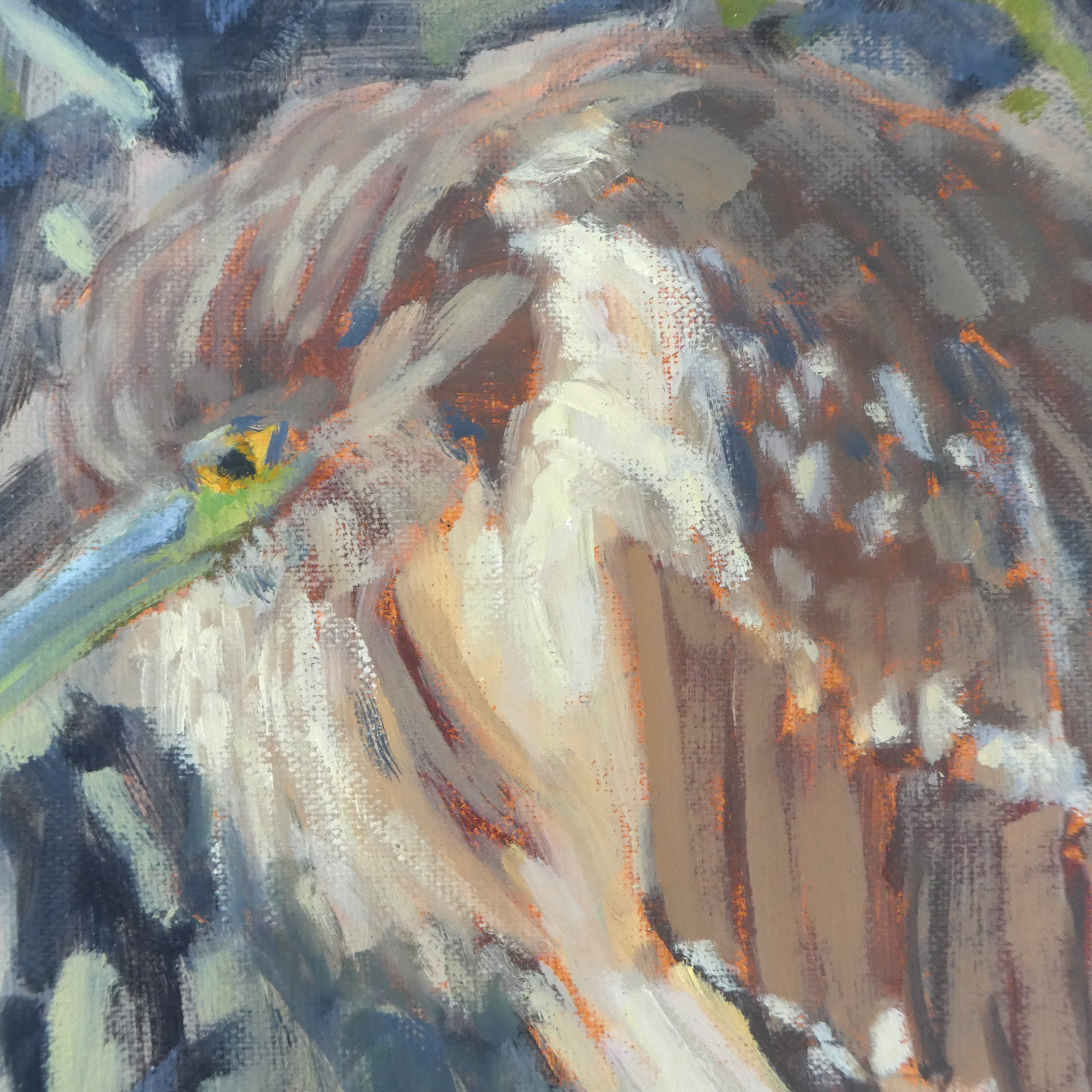 This is a oil painting is of a juvenile night heron I glimpsed at the Las Gallinas Wildlife ponds. The ponds are a nesting area for Night Herons. I only saw this bird once.