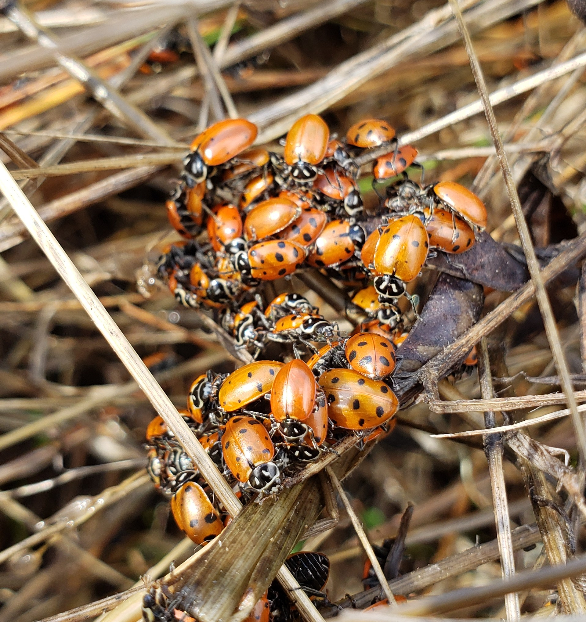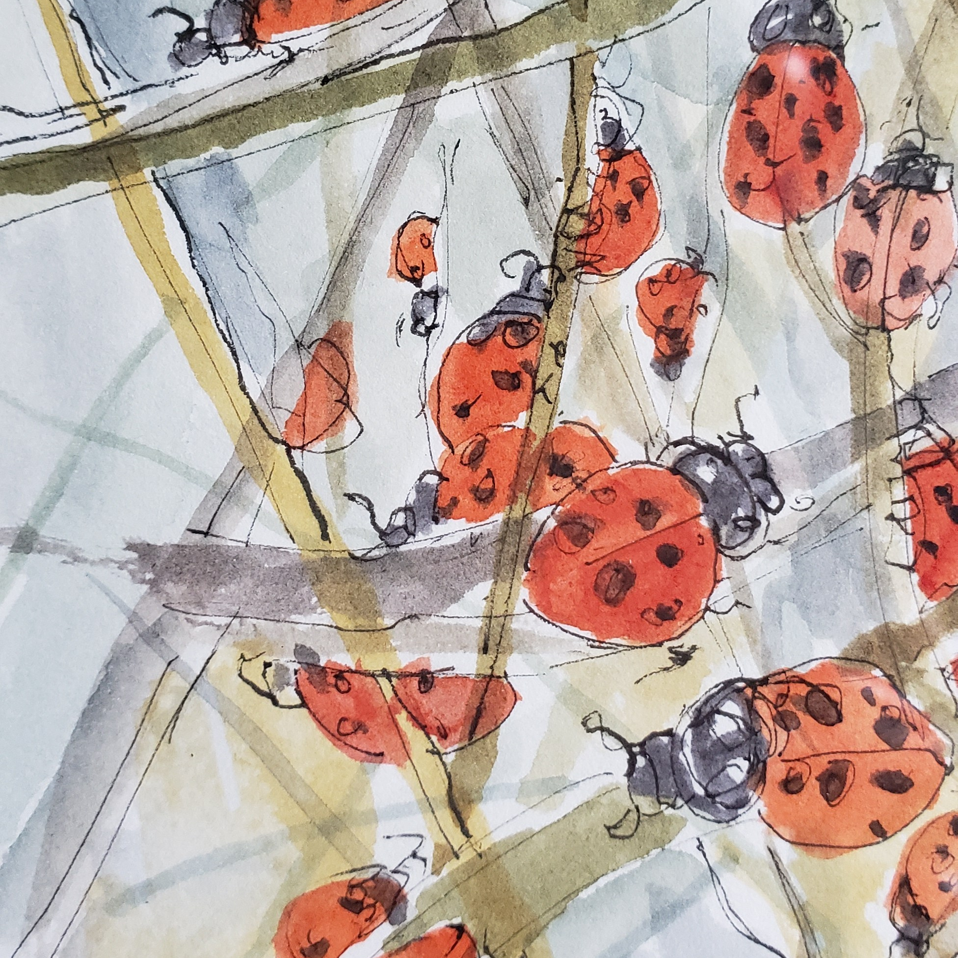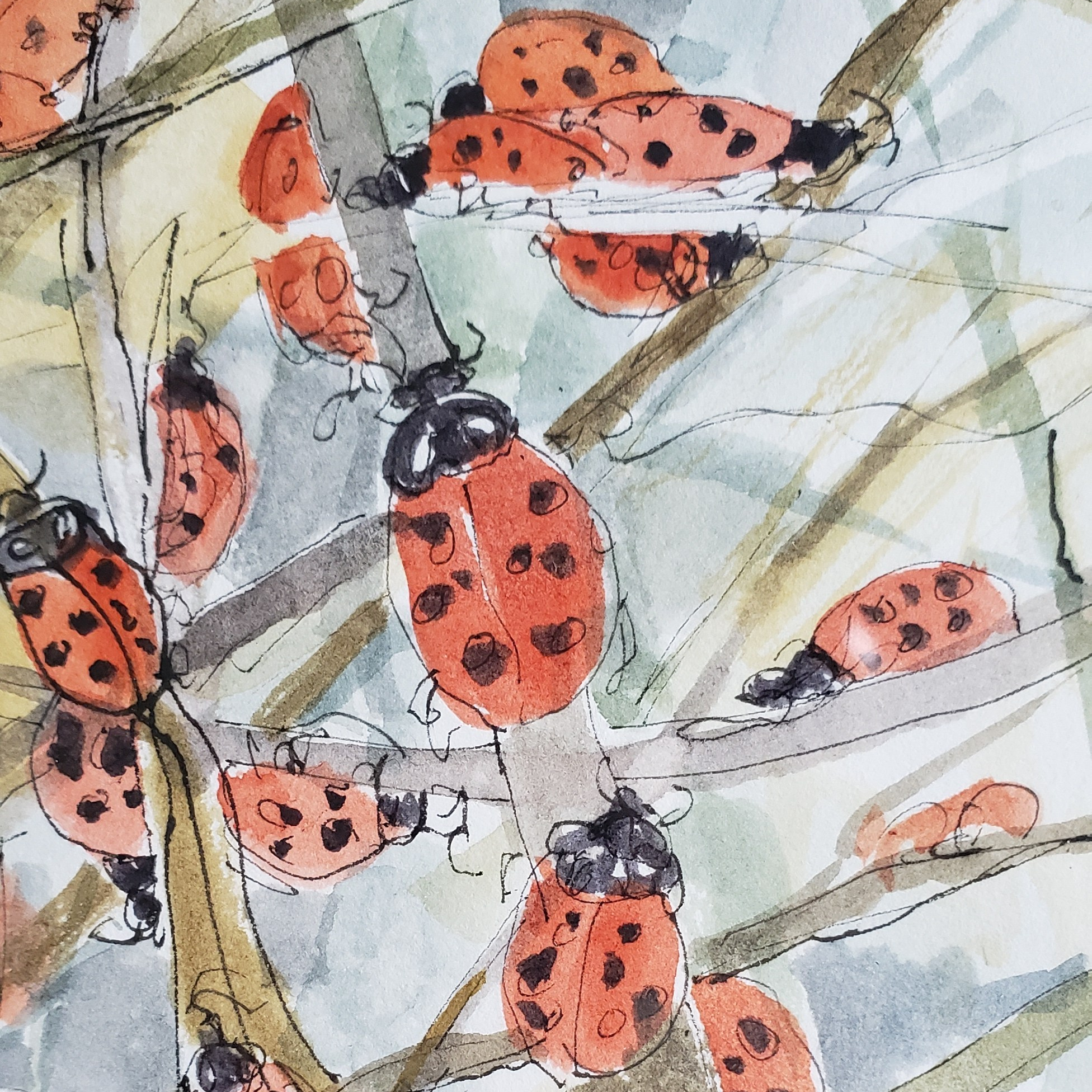 Out at Samuel P Taylor Park I came across a large group of ladybugs. I liked the chaos and movement in the group I sketched this in ink and watercolorI added a piece by Tuppy Lawson of a turtle playing a musical instrument in front of the 12 inch framed watercolor.