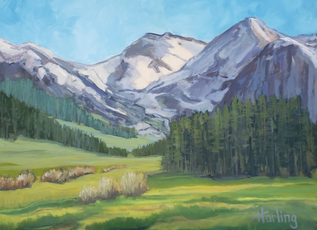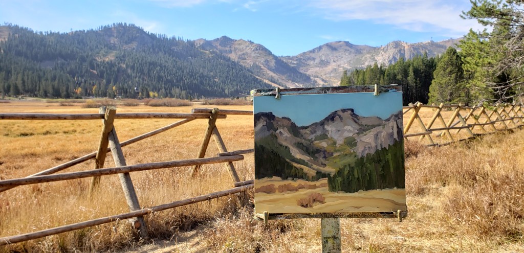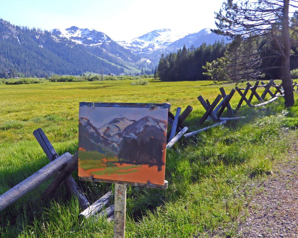 It started on Summer Solstice in 2017. I stood in Squaw Valley along the bike path and painted a view looking up the valley to celebrate the day. This painting sold soon afterwards in HCH. Fast forward to 2020 and a couple came to HCH and expressed they would like a larger version of this painting for their home.