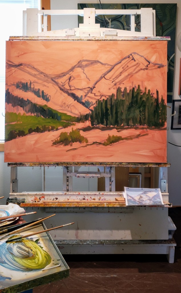 Here was the start of 48×36 in canvas in my studio. I was going to be painting a valley of the beginning of a summer.