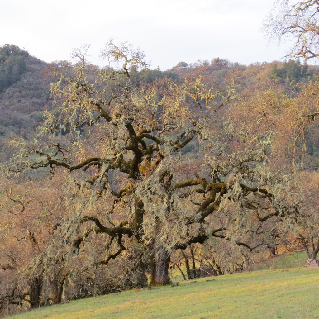 There are cows are just to the right of the tree trunk. This oak was majestic with all the colors of lichen and catkins clinging to its large branches. Lace lichen the light sage green on the tree is common in the coastal range and frequently on oak trees. It is an important food for deer and many species of birds use it for nests.