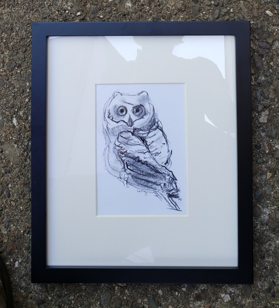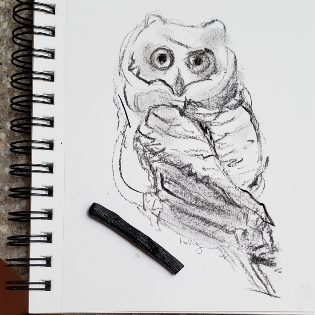 Owlet Posted on May 25, 2021 by crystal harling Apple stick charcoal sketch of Owlet . We use the apple sticks from our tree to add a slight smoky flavor to our bbq. I discovered I can sketch with them. I choose simple frame for the owlet. Last photo before the two owlets left the nest. Share this: Click to share on X (Opens in new window) X Click to share on Facebook (Opens in new window) Facebook Like Loading... Related