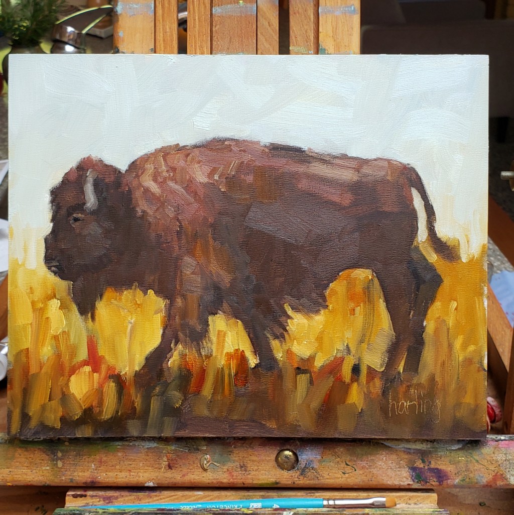 They moved slowly thru the dried grasses and wild sunflowers. After looking at photos I chose this one to paint on a panel. American Bison 8×10 in panel