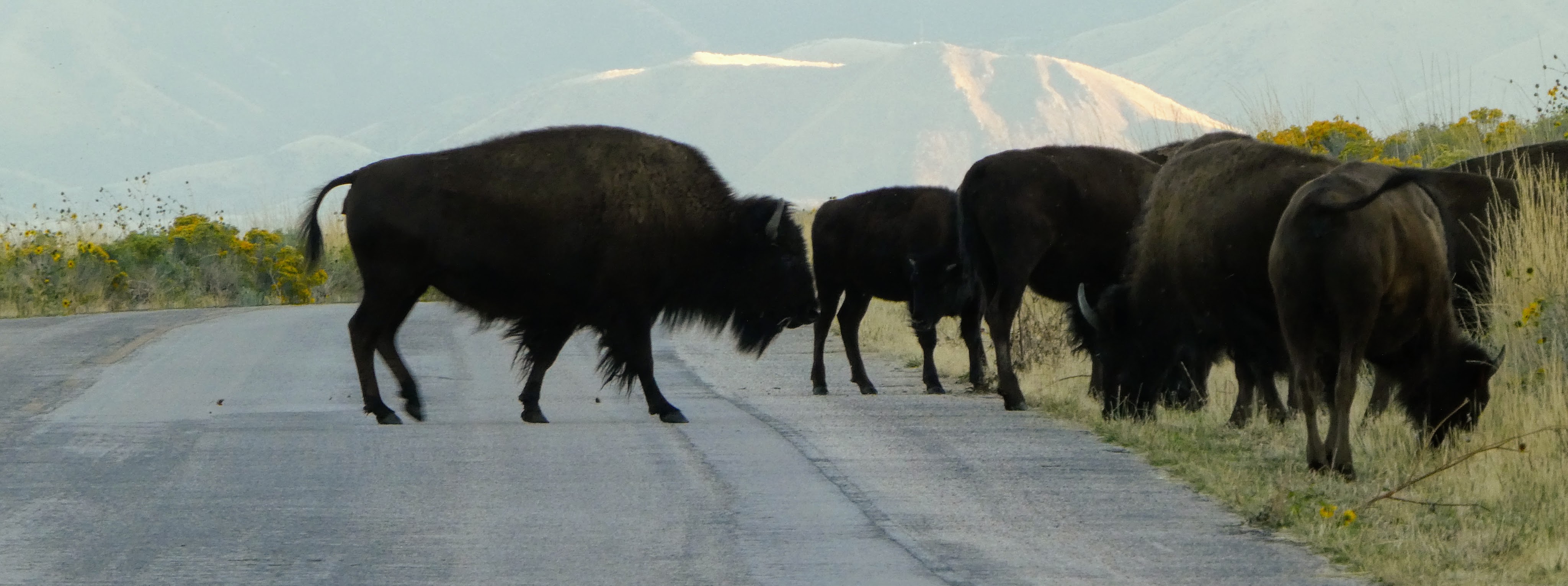 A few years ago I visited the Antelope Island in Salt Lake City near the town of Layton. The bison herd in the park was established in 1893. The herd crossed in front of my car. It was late afternoon, and I thought the warm horizon highlighted the herd. I snapped photos from car and enjoying the movement of the herd thru dry grass and sunflowers.