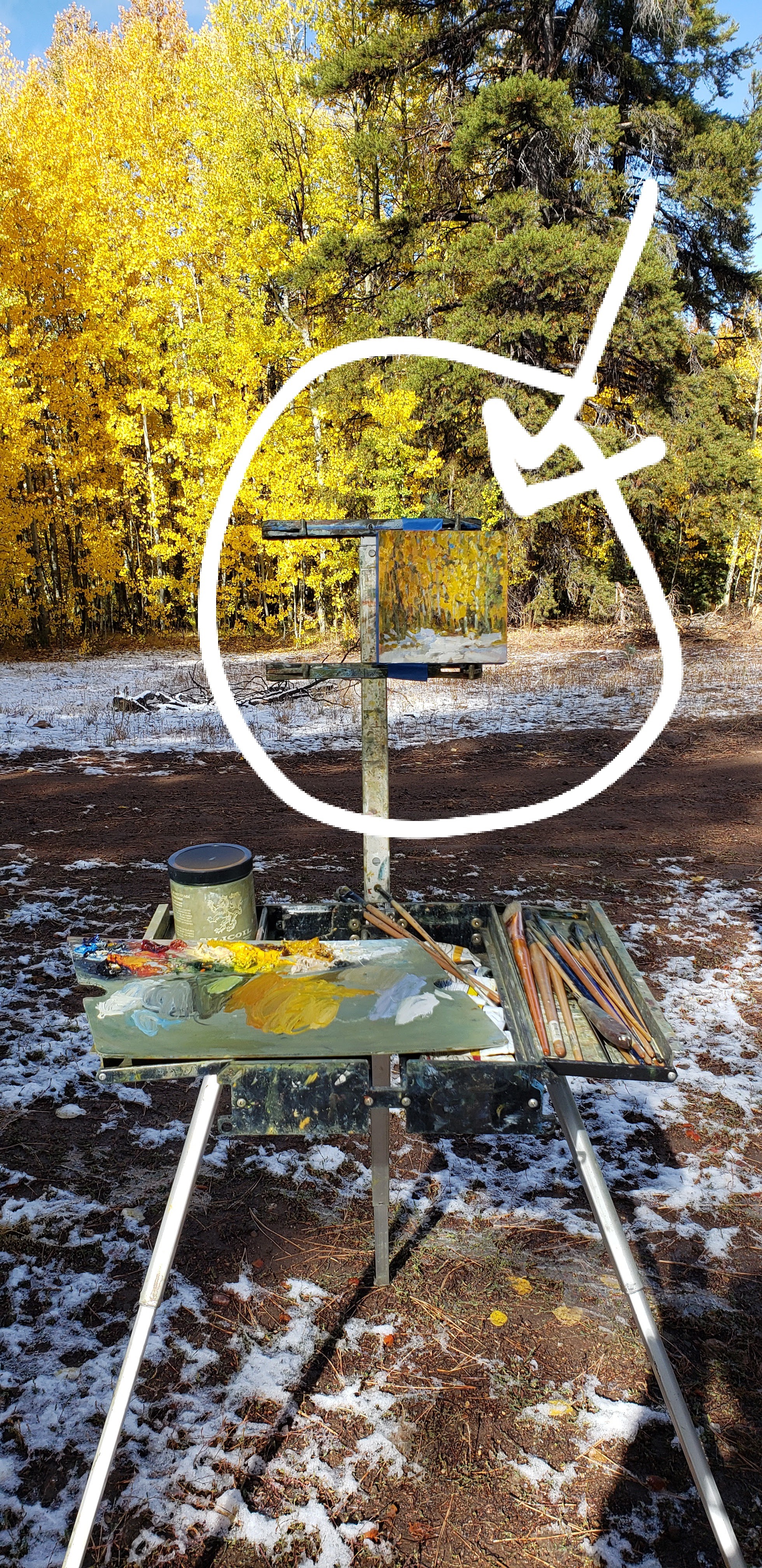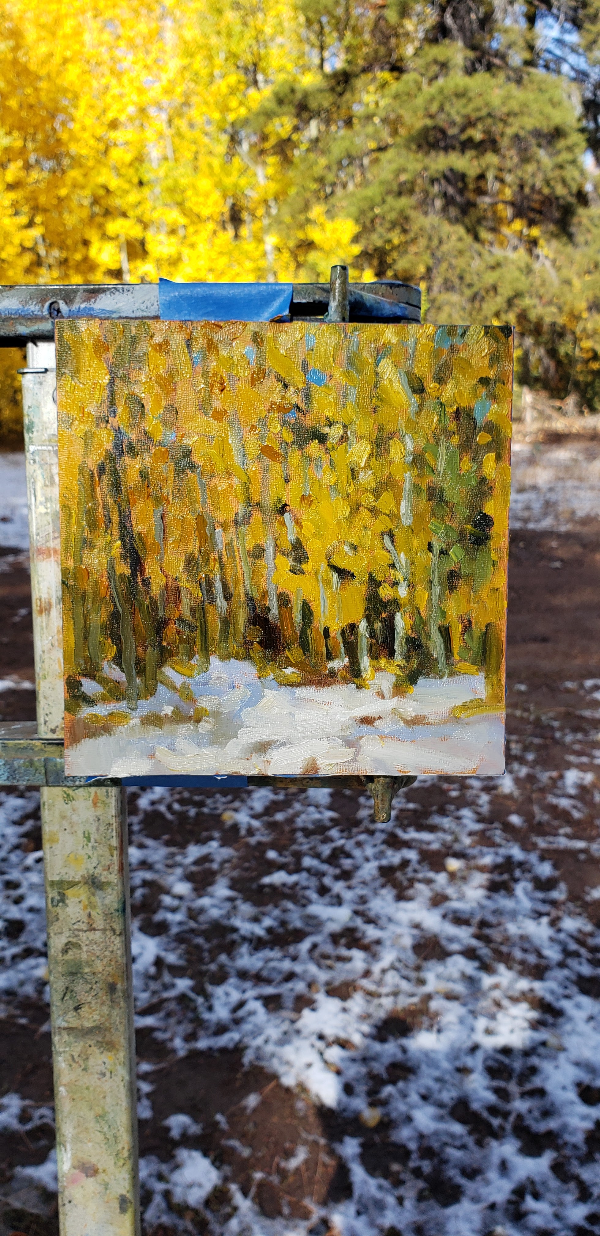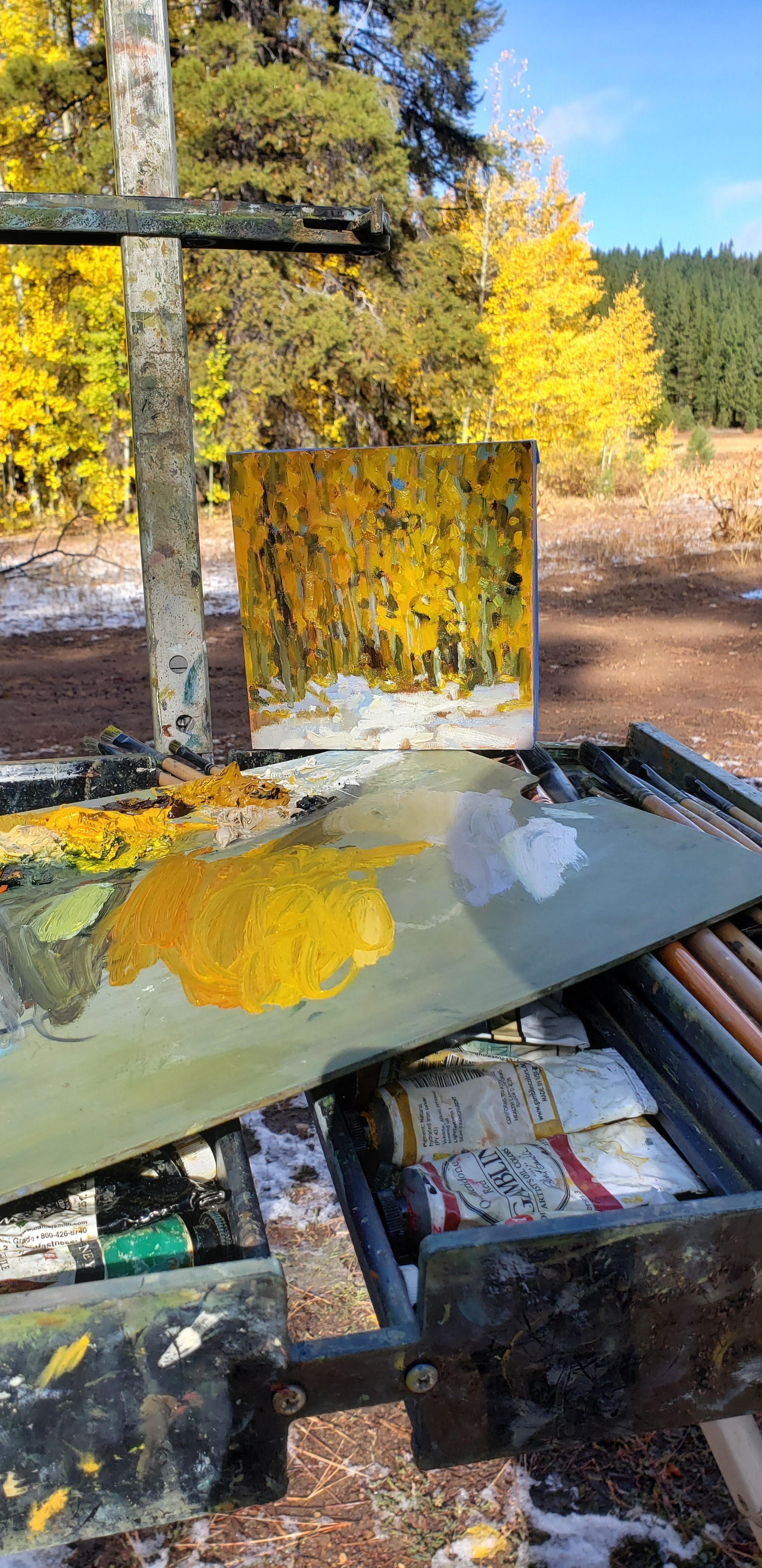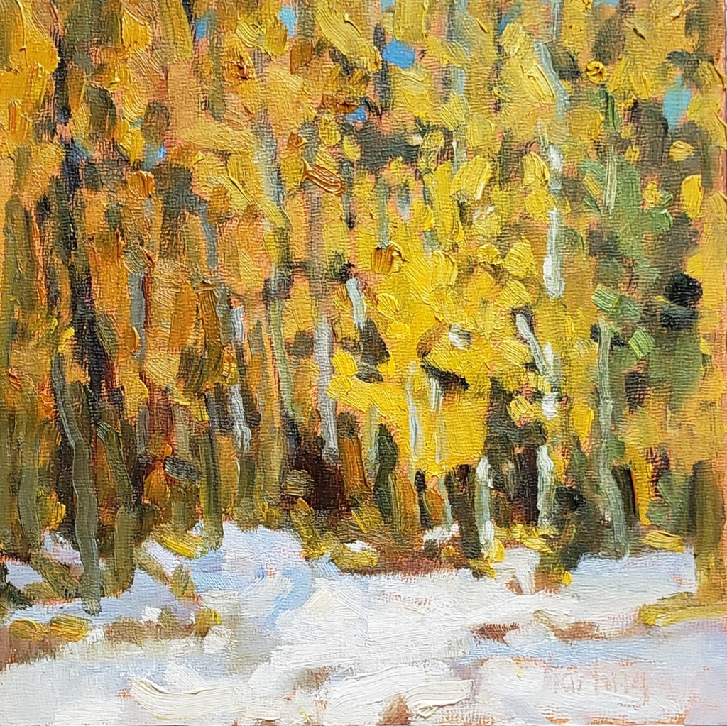 Snow Posted on October 15, 2021 by crystal harling It was 39% out so I chose a small panel to paint a quick view of aspen and snow before the afternoon sun melted it away. Snow in Meadow panel 6x6inch. Share this: Click to share on X (Opens in new window) X Click to share on Facebook (Opens in new window) Facebook Like Loading... Related