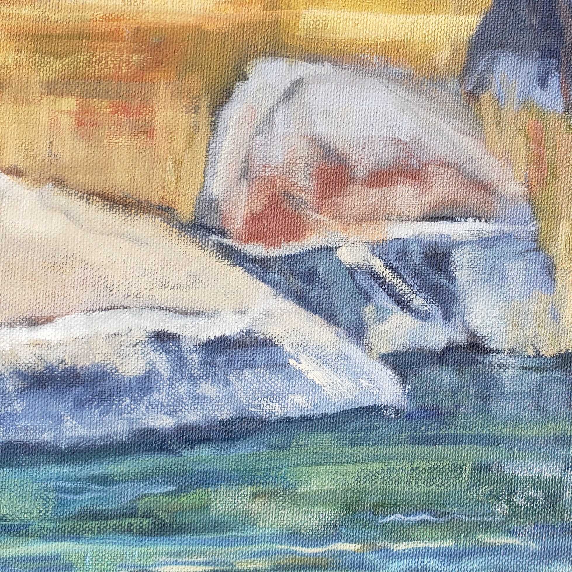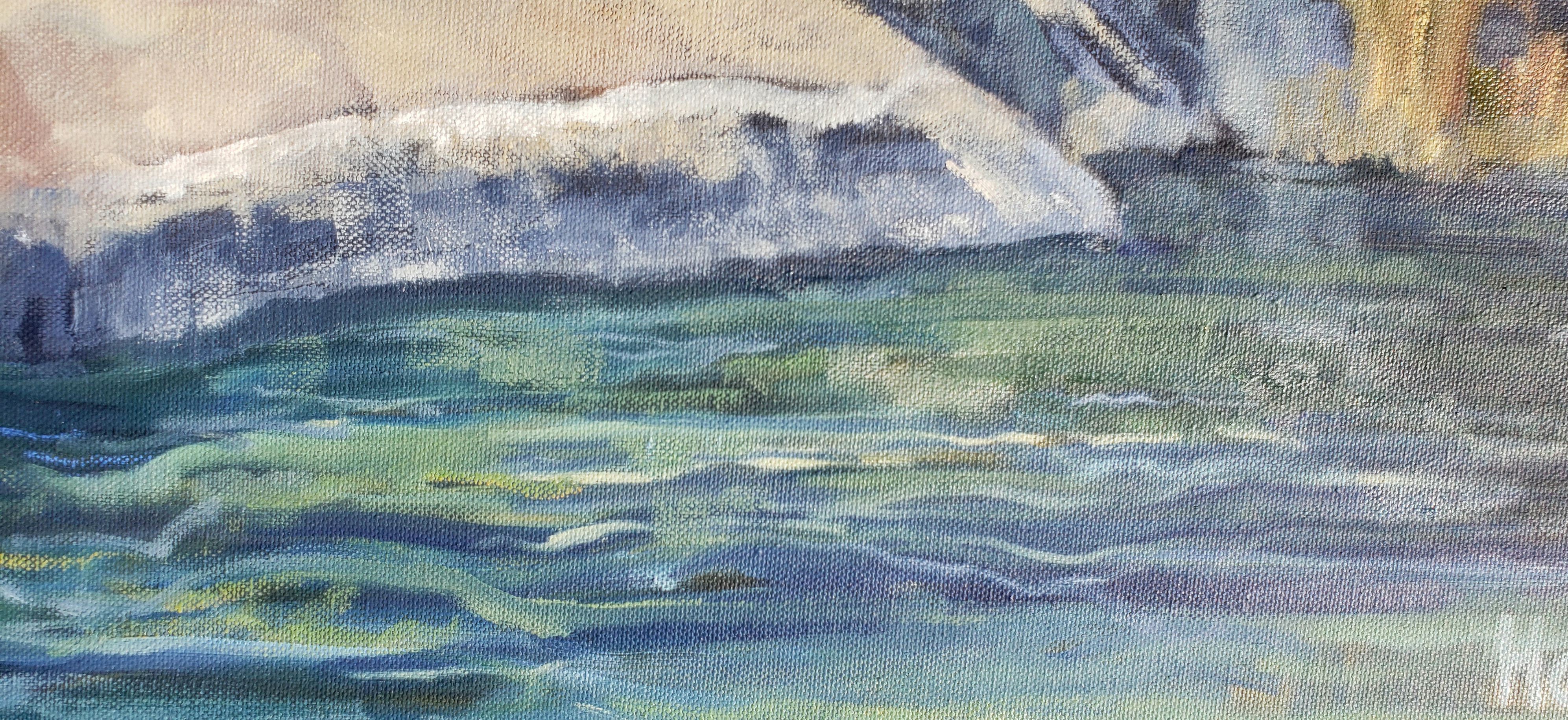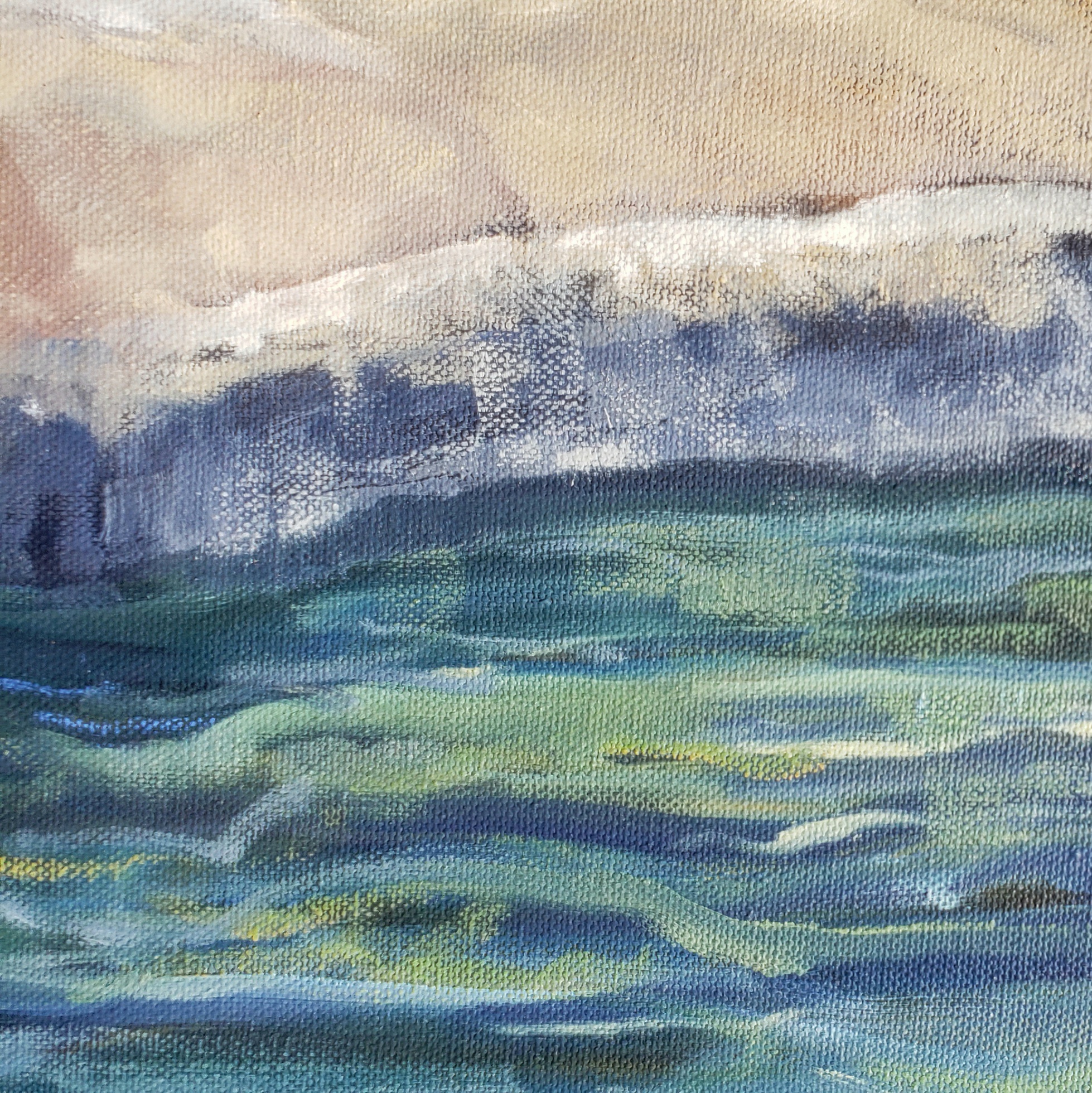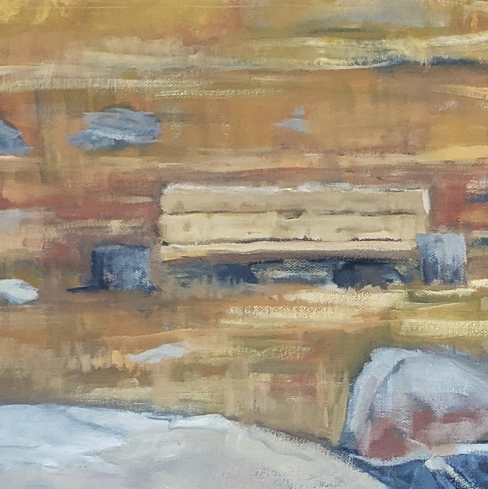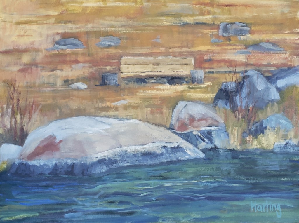 To paint this view I wanted some texture underneath, so I used a canvas that had a sketch of a old shack in Sierra county. I turn the canvas upside down so my eye ignores the underpainting.