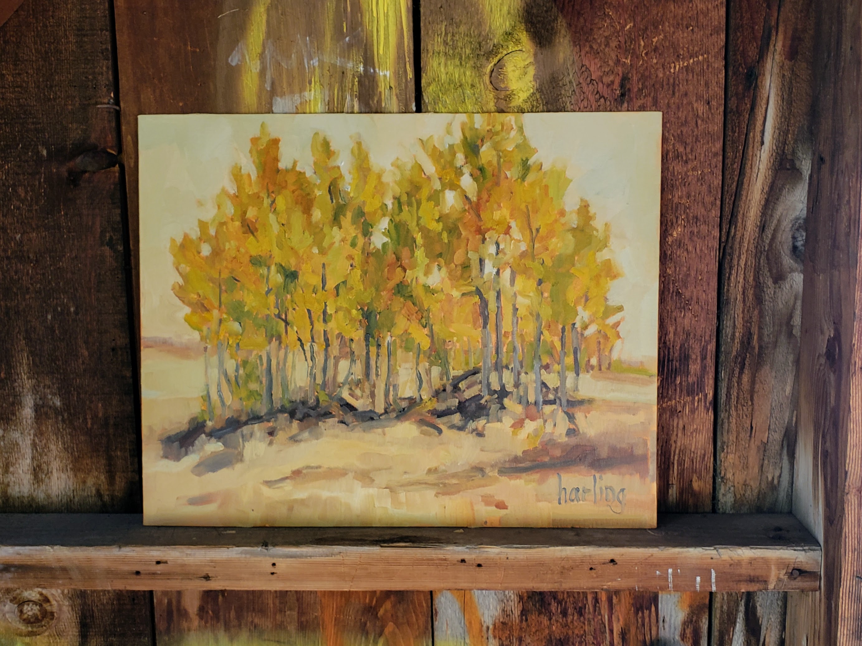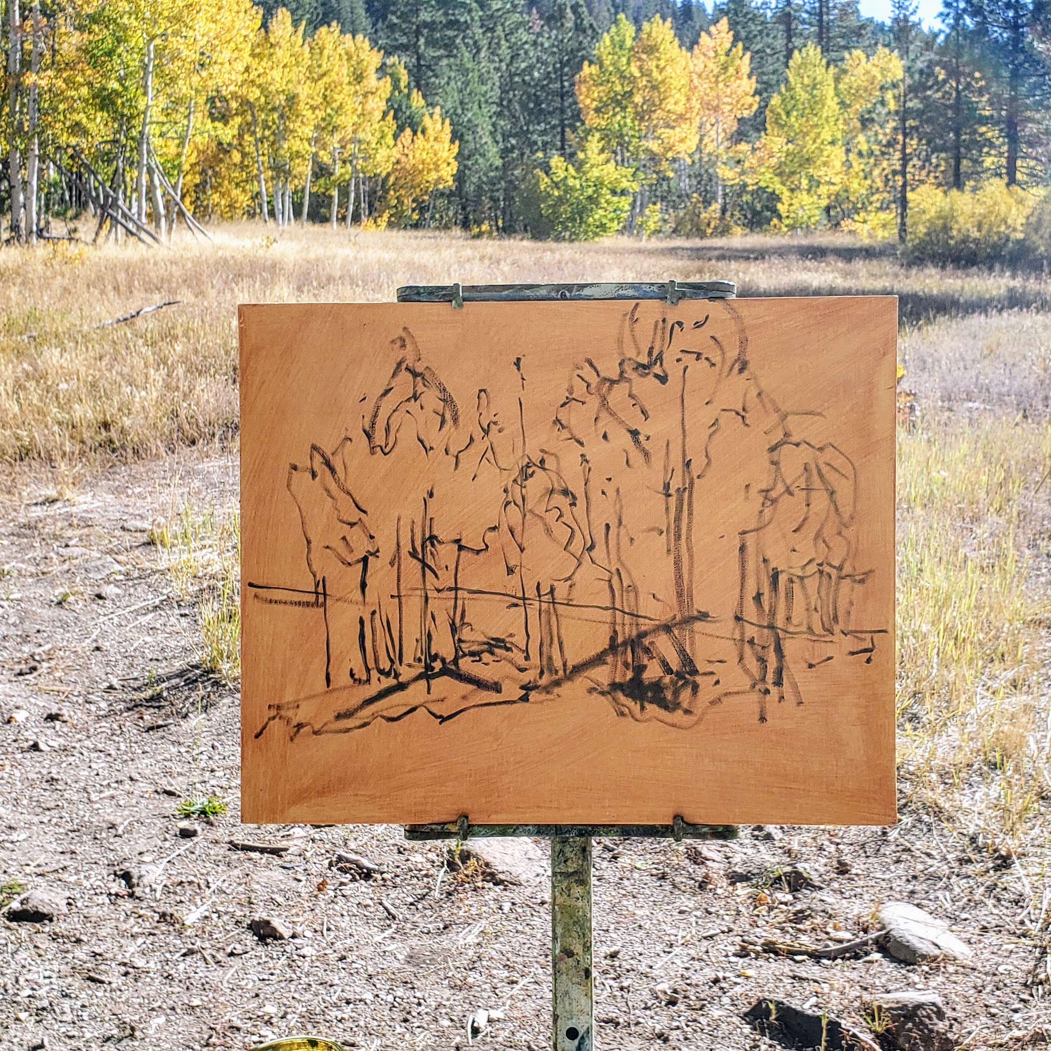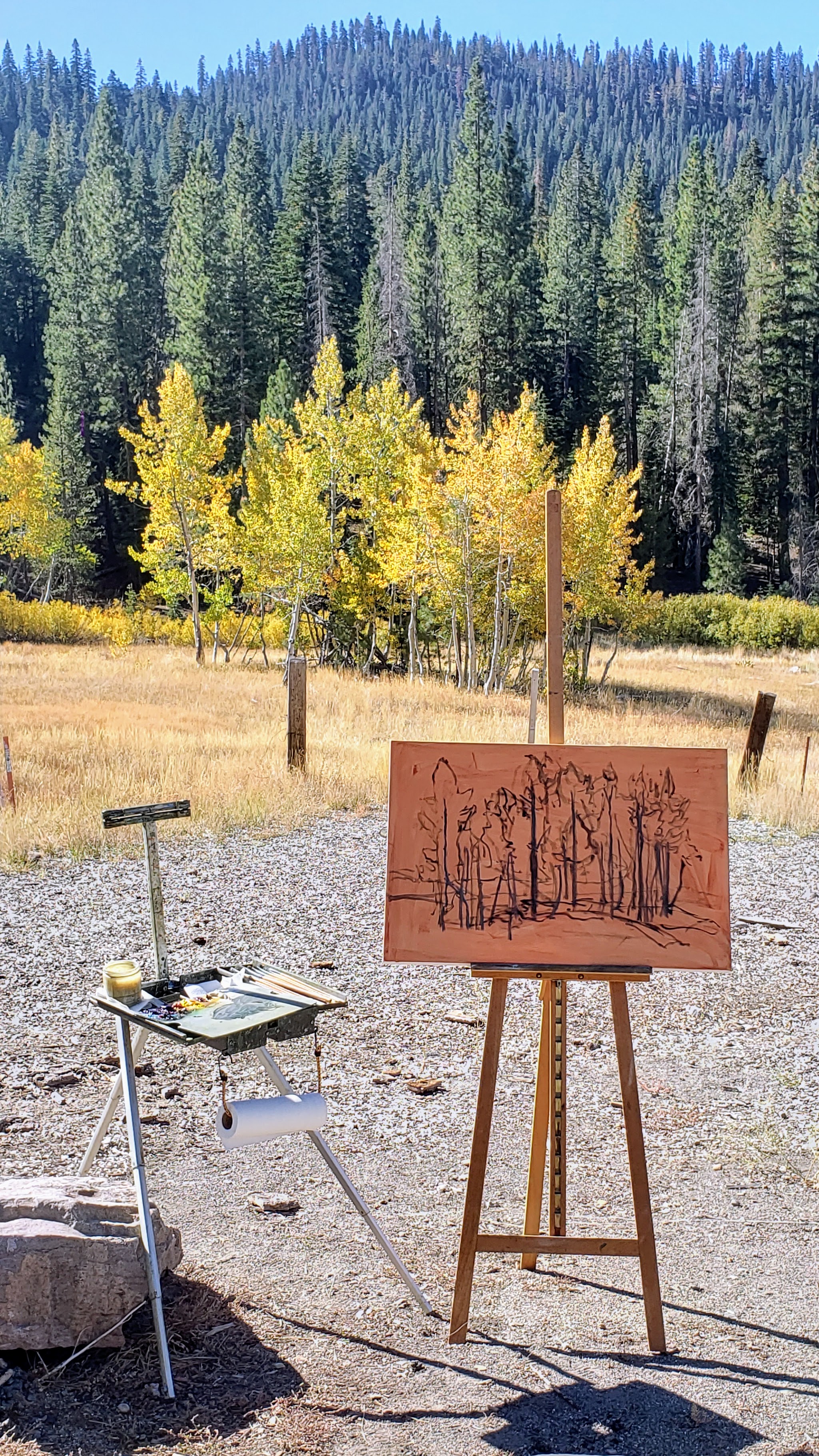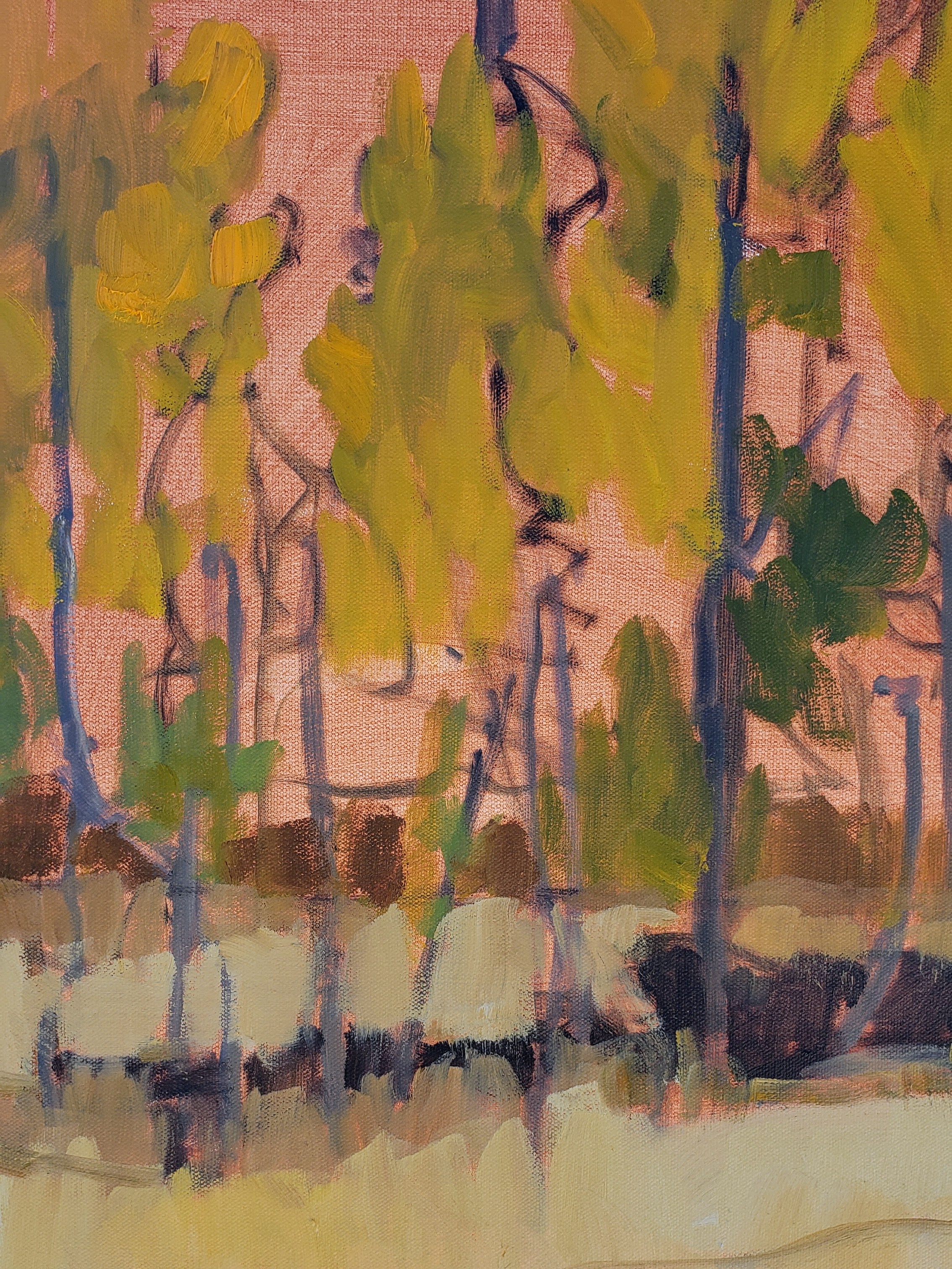 Over the years painting this grove I like to experiment with different size canvas with backgrounds that may or not be actually there. This first one is with the pines behind the trees. The weather is warm, no smoke or wind. So I keep coming back.