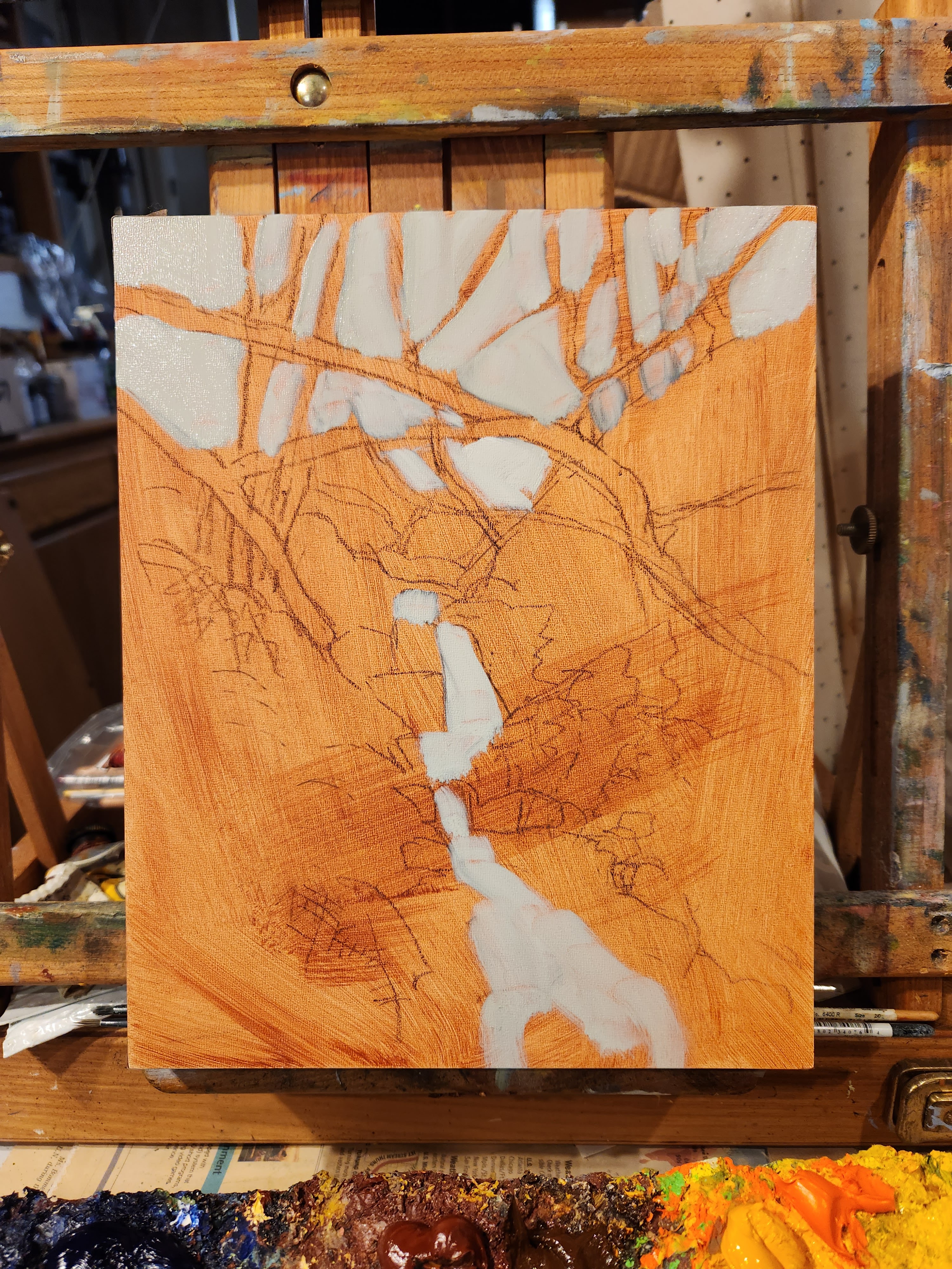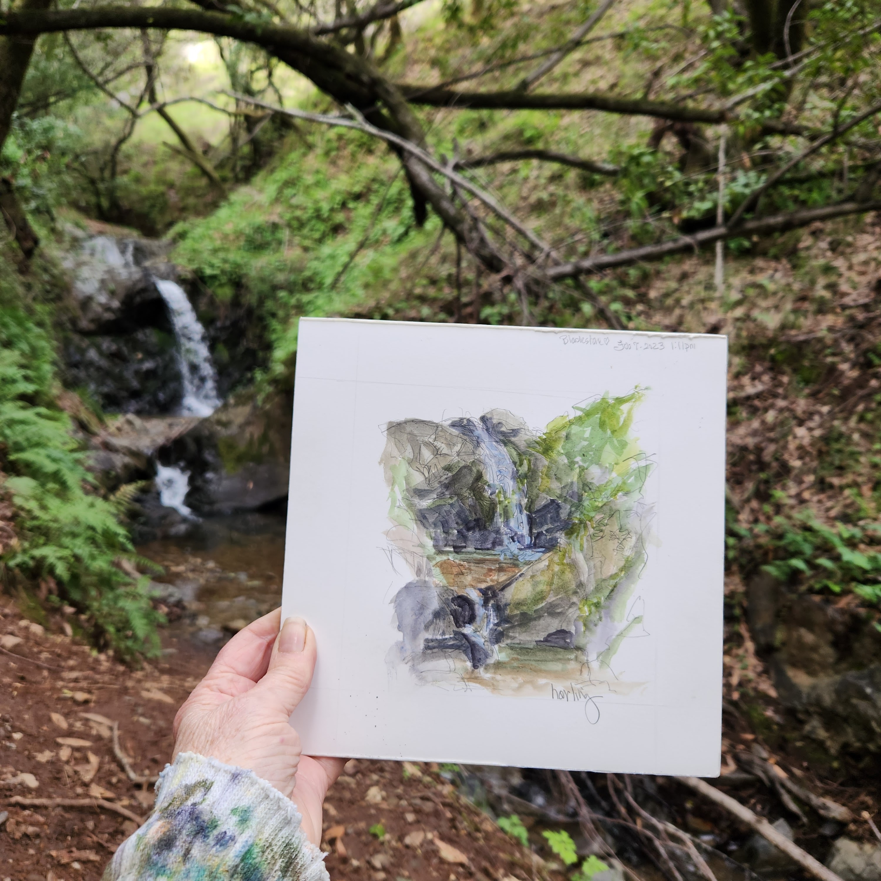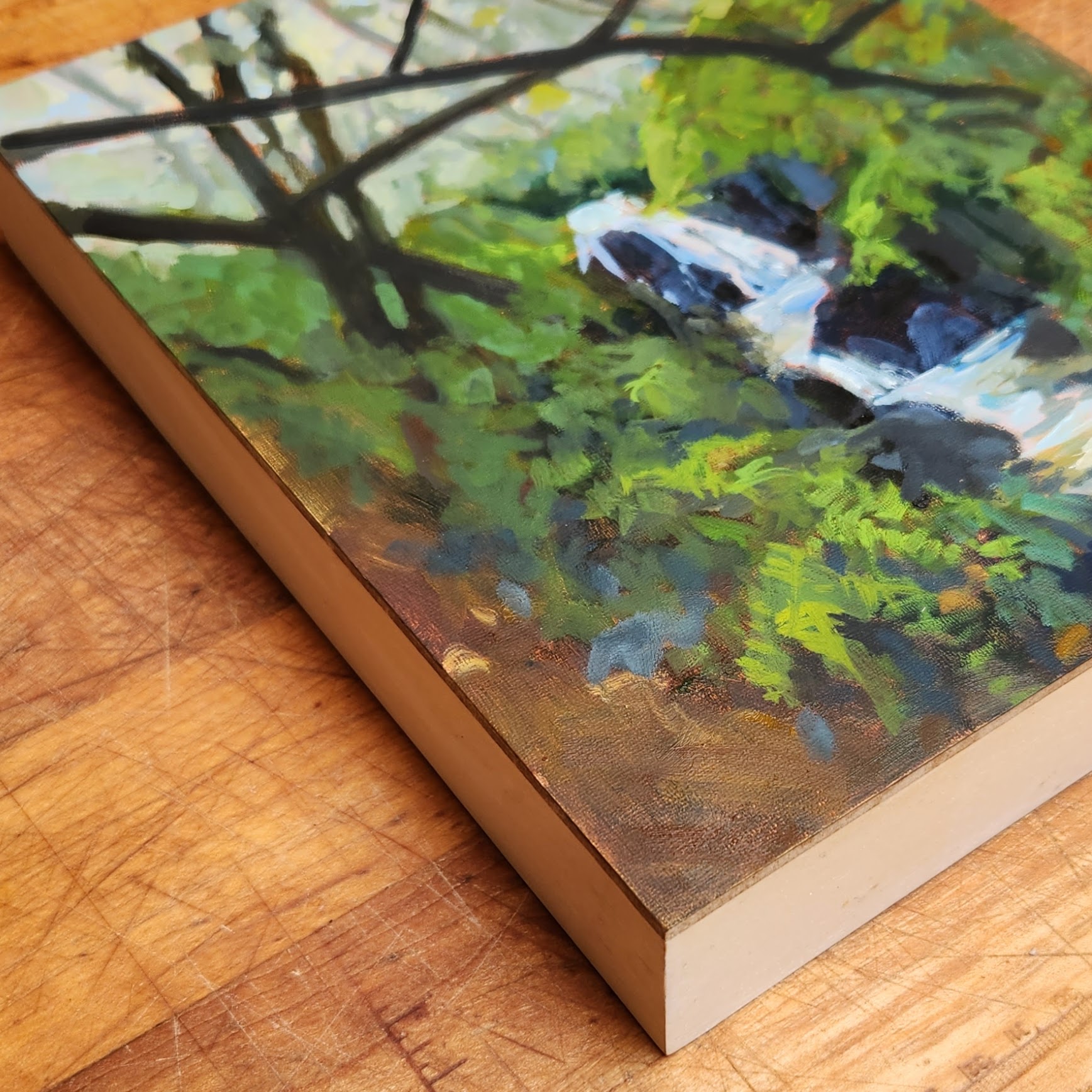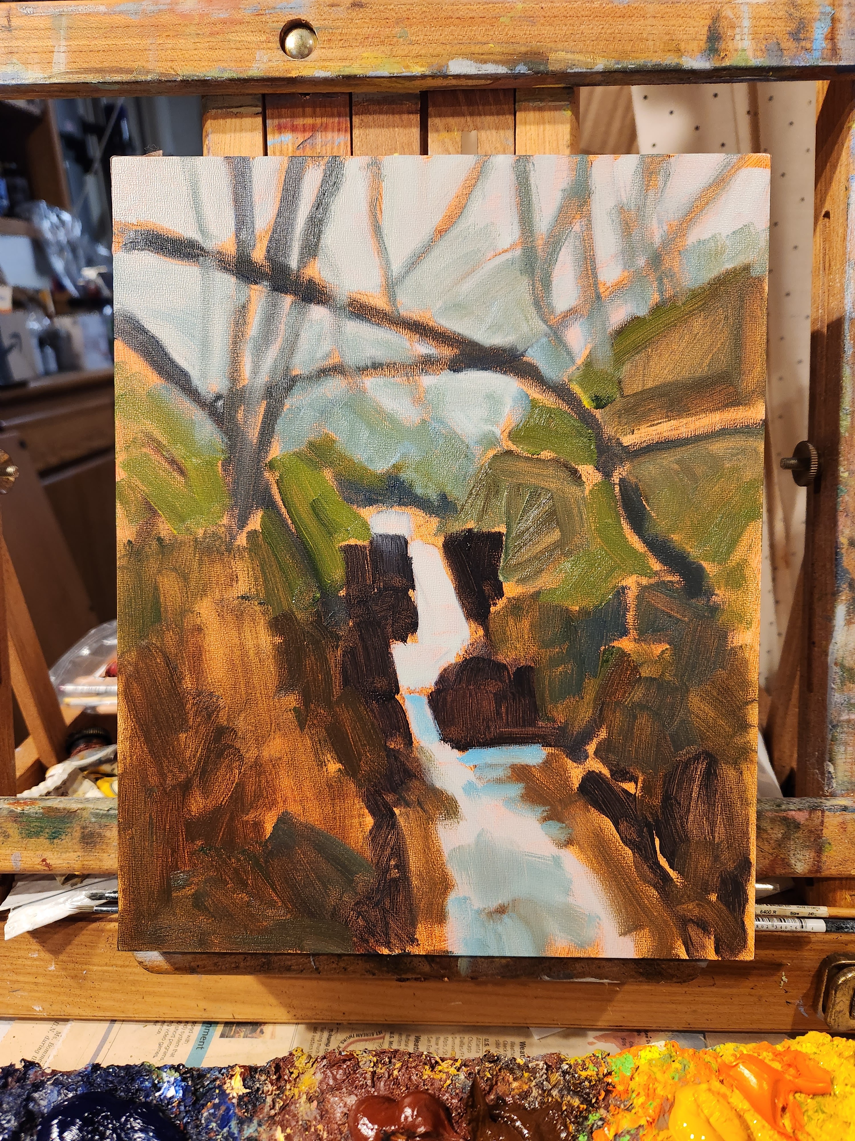 This spot along the Blackstone canyon trail is a good sign we got some rain. I sat and did a watercolor sketch near the trail. Then came home and painted this view in oils on a 8×10 inch panel. The panel is 1 1/2 inches deep.