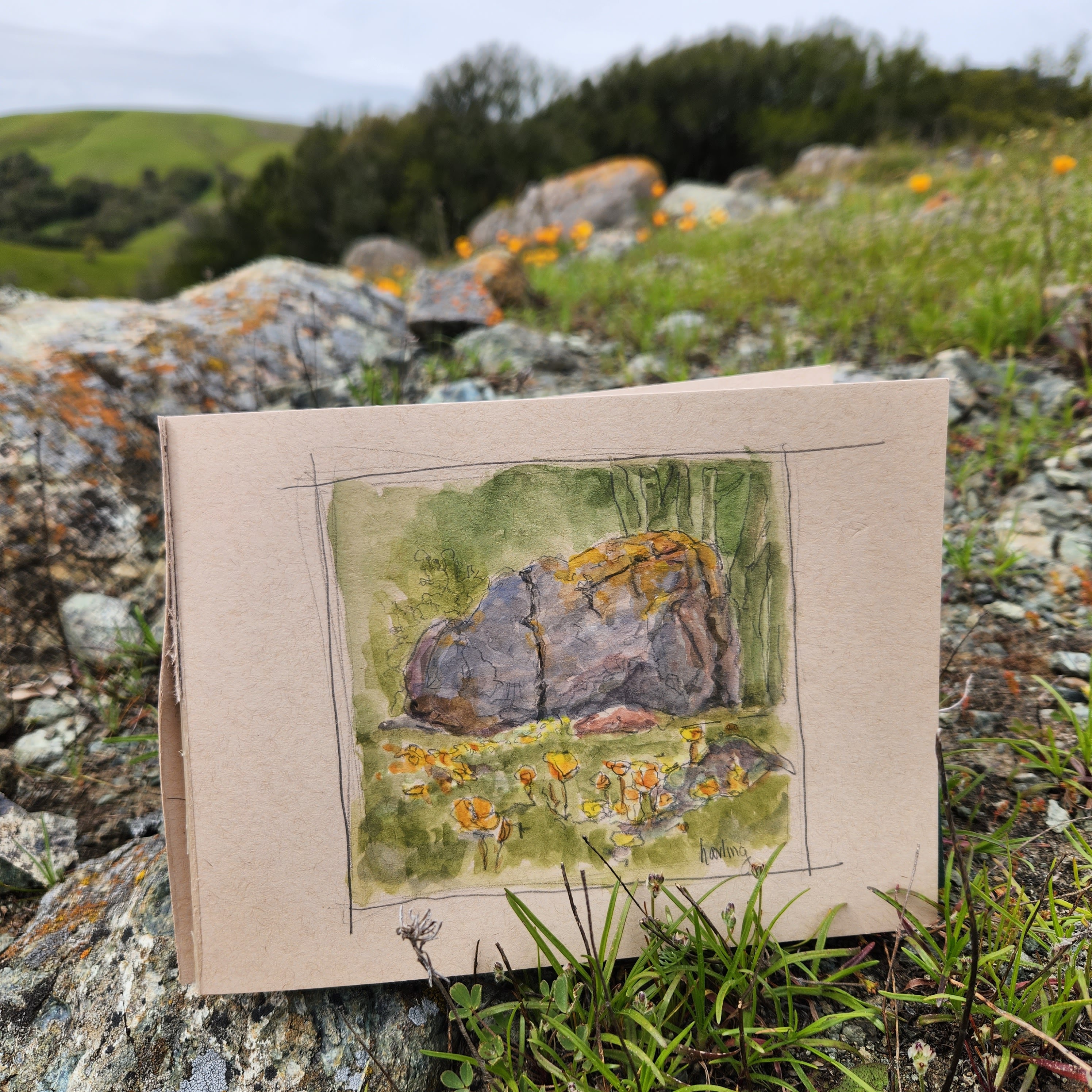 I sat on top of the ridge and did a watercolor of a rock outcropping and with poppy spreading out around it.