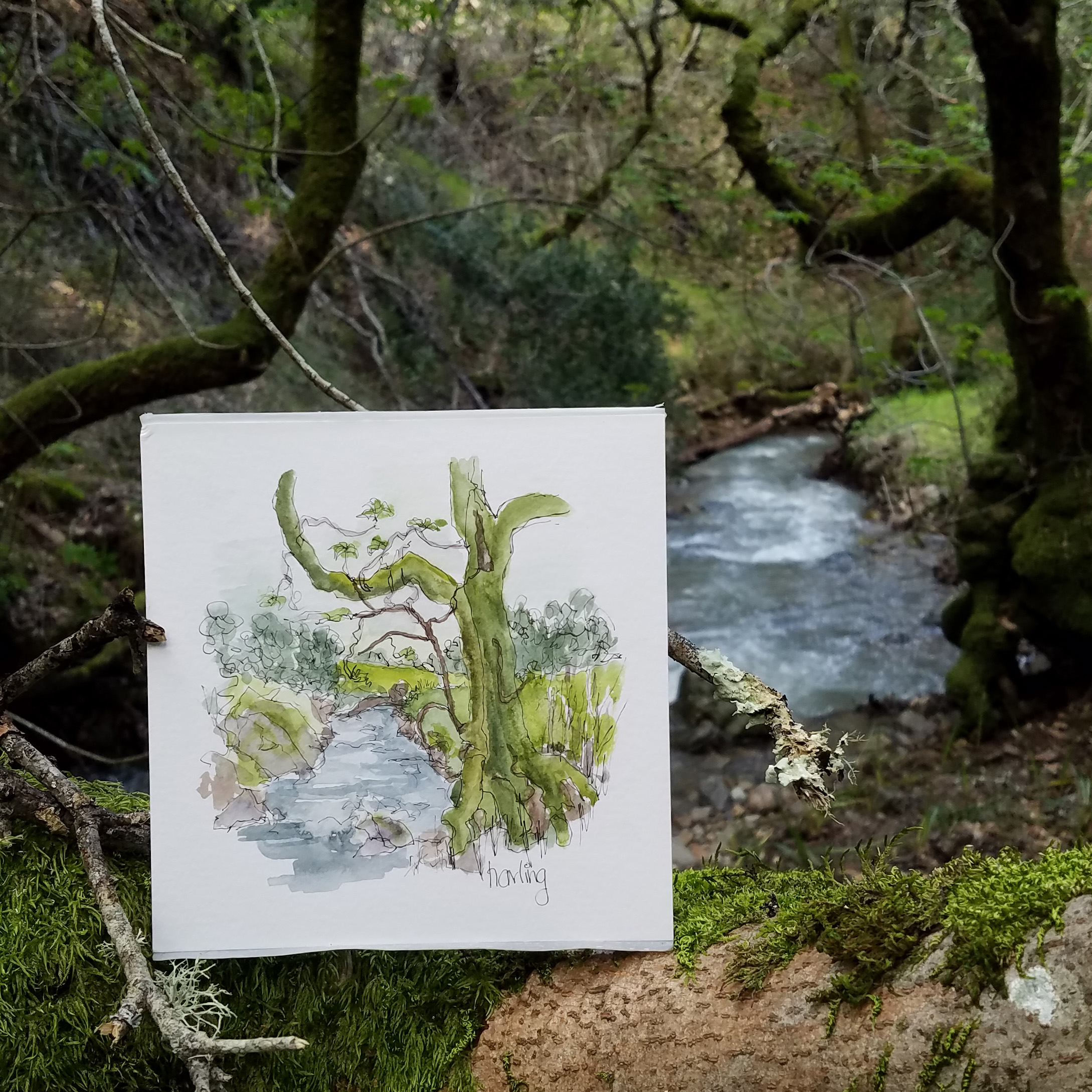 After a big rain the creek is up to the banks of the buckeye tree. I am drawn to the shades of green moss and new buds of the tree popping open. I did a quick study with pen and watercolor.